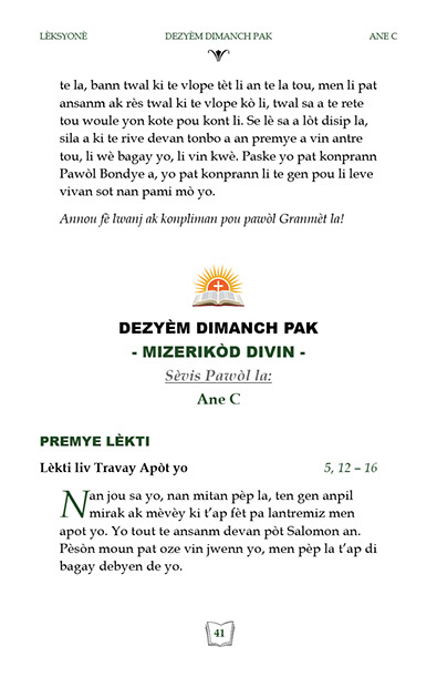 Liv sa genyen lèkti ak levanjil lamès chak dimanch Tan Lavan Tan Karèm Ane C. Yon bon Gid pou Katolik.